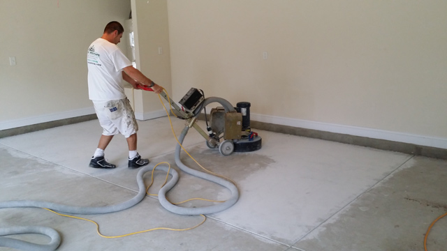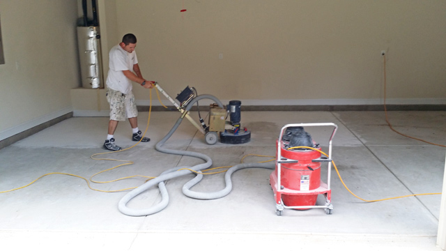 As with most projects, this garage floor in Willow Springs required prep work. Here are diamond grinding the floor to remove contaminates and set up a new profile for the Epoxy to bound to. This is an important step that ensures a fantastic finished product.
